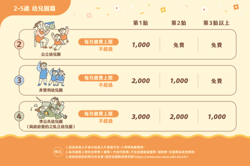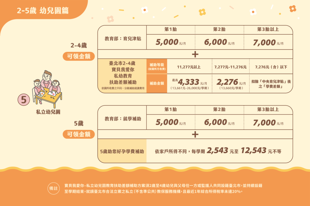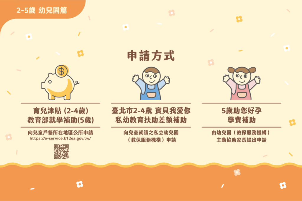 幼兒園補助將 2-5 歲小朋友送至公立/非營利/準公共化幼兒園皆可領取補助。